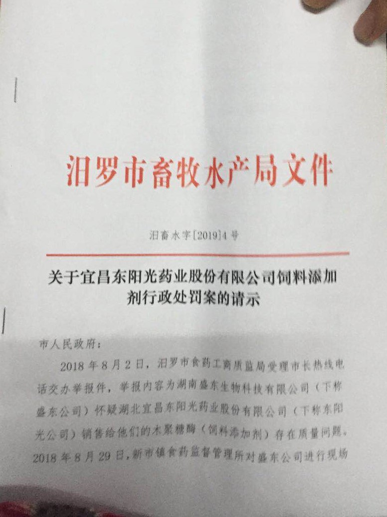 据谢金凤提供的照片显示,汨罗市畜牧水产局以“汨畜水字[2019]4号”红头文件,向汨罗市政府发出《关于宜昌东阳光药业股份有限公司饲料添加剂行政处罚案的请示》。
