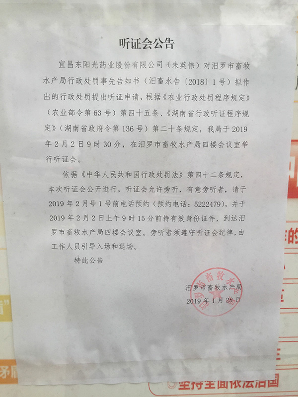 四个月前,港股“东阳光药”(01558.HK)母公司宜昌东阳光药业股份有限公司(下简称“东阳光公司”)因三个批次饲料添加剂木聚糖酶被检出沙门氏菌,经汨罗市畜牧水产局立案调查后,拟对该公司作出前述行政处罚。