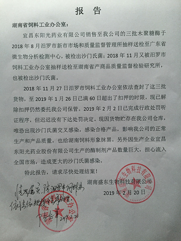 湖南省饲料工业办公室主任陈志军向澎湃新闻证实,就东阳光公司三个批次饲料添加剂木聚糖酶被检出沙门氏菌一事,他曾就此进行批示,还曾向汨罗市饲料办发函,要求依法依规处理,但不知何因,汨罗当地迟迟未下达处罚决定。