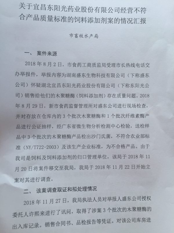 疑似畜牧局汇报材料称:处罚将影响美国东阳光药上市